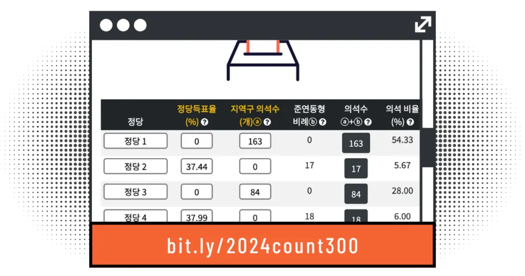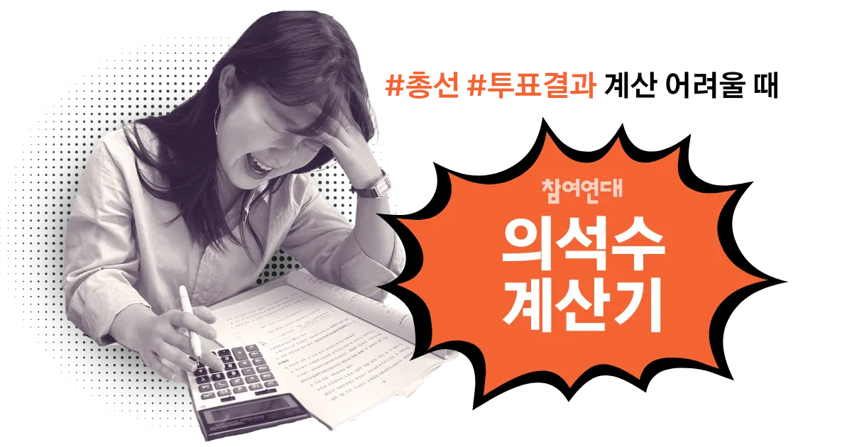 참여연대 의정감시센터의 실행위원들의 검증을 통해 만들어진 <22대 국회 의석수계산기>를 활용하시면 공식이나 배분 원칙을 몰라도 예상 의석을 쉽고 빠르게 확인할 수 있습니다. 유권자들에게 많은 도움이 되기를 희망합니다.