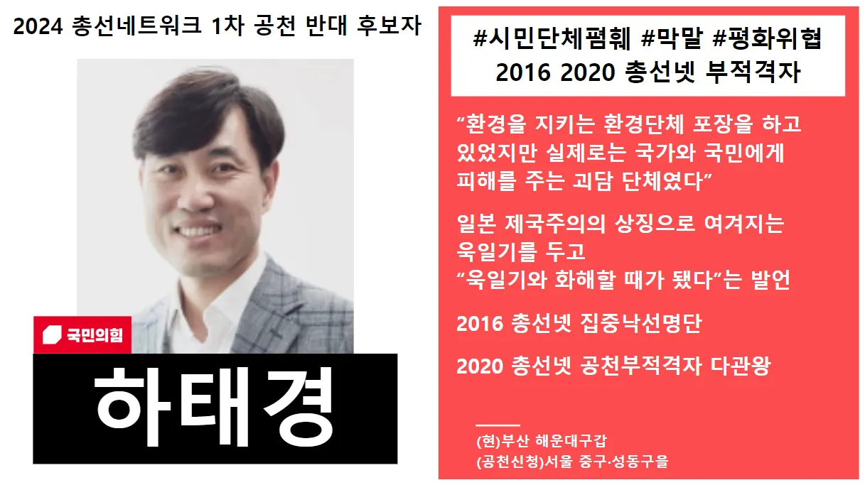 구체적인 선정사유 | (1) 21대 국회의 정보위원회 간사, 국방위원회 위원으로서 “환경을 지키는 환경단체 포장을 하고 있었지만 실제로는 국가와 국민에게 피해를 주는 괴담 단체였다”는 발언을 일삼으며 환경 보전을 위한 시민들의 자발적 결사체인 환경단체의 활동을 폄훼하고 이를 규제하기 위해 시도하는 등 국민의 대변자인 국회의원으로서의 본분을 망각하는 발언과 활동을 주도한 책임이 막중하기에 핵심공천부적격 후보로 선정함.