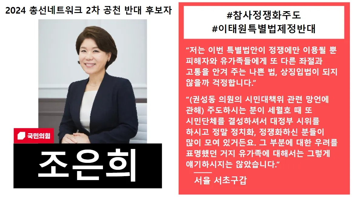 선정기준 | 이태원참사 진상규명 방해 및 유가족 모욕, 진상규명 특별법 제정 반대한 후보자 |
