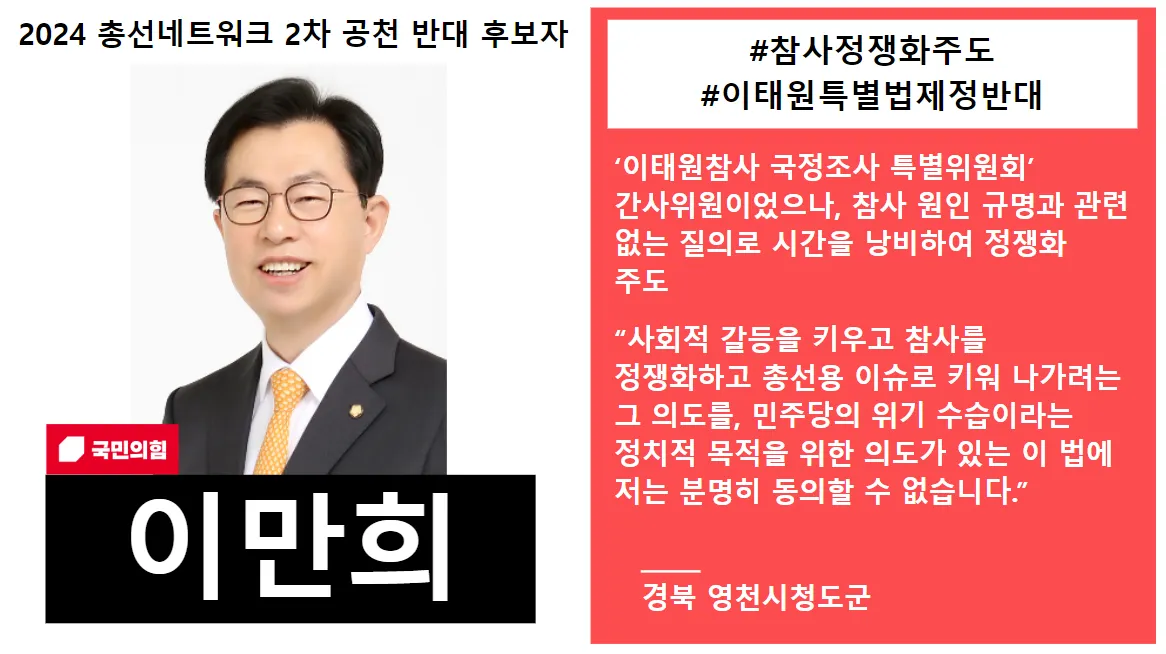 선정기준 | 이태원참사 진상규명 방해 및 유가족 모욕, 진상규명 특별법 제정 반대한 후보자 |