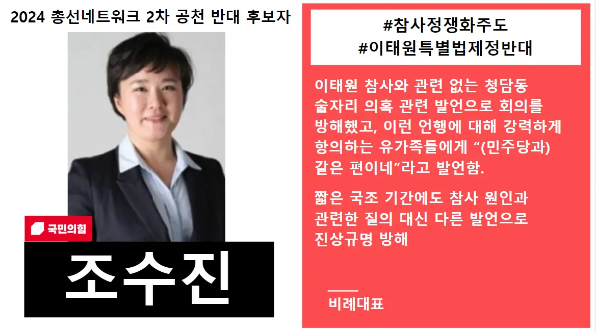 선정기준 | 이태원참사 진상규명 방해 및 유가족 모욕, 진상규명 특별법 제정 반대한 후보자 |
