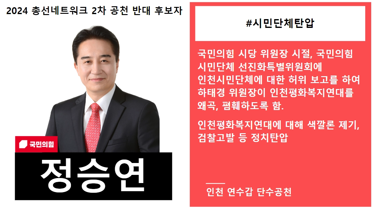 구체적인 선정사유 | - 2023년 국민의힘 인천시당 위원장 재임 중, 국민의힘 시민단체 선진화특별위원회(위원장 하태경) 7차 회의(2023.7.4.)에 인천시민단체에 대한 왜곡된 내용을 보고하여 하태경 위원장이 ‘정의당 하부 조직인 인천시민단체가 주민참여예산을 주물렀다’, ‘인천판참여연대인 인천평화복지연대가 있다’는 등 인천평화복지연대와 관련해 왜곡·폄훼하도록 함. 이후 인천평화복지연대에 대해 색깔론 제기, 검찰에 고발까지 하며 정치탄압으로 이어감. |