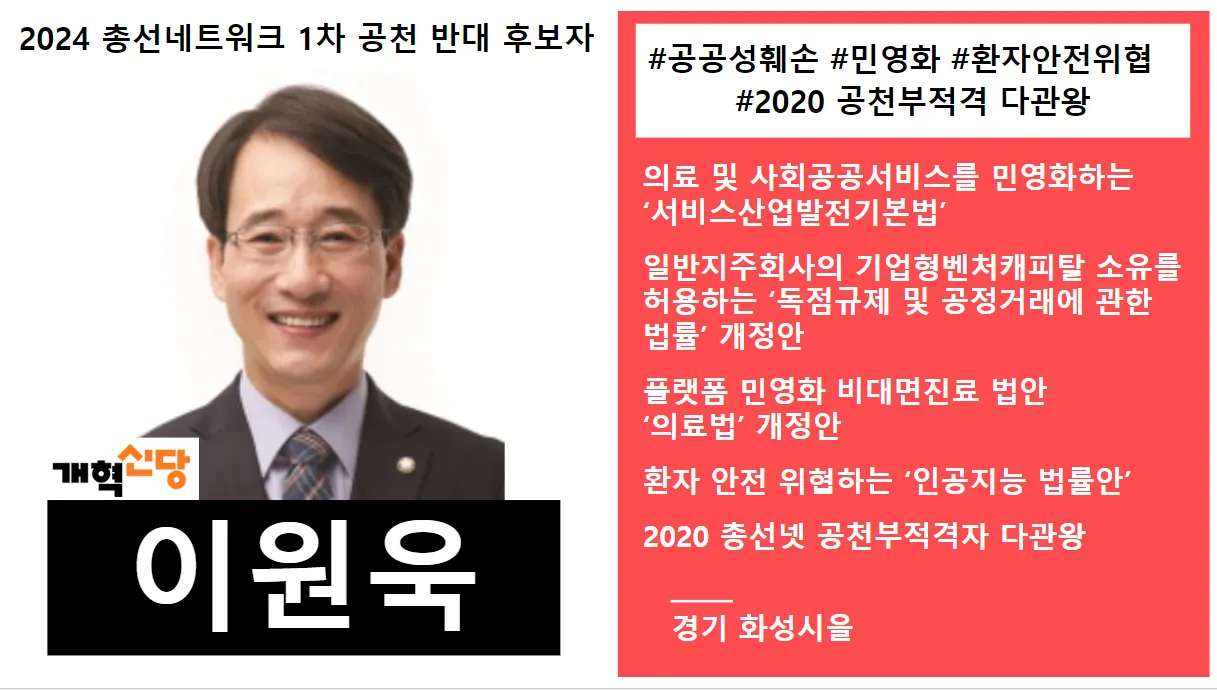 구체적인 선정사유 | (1) 이원욱 의원은 의료 및 사회공공서비스를 민영화하는 서비스산업발전기본법을 대표발의함. 해당 법안은 농림어업, 제조업을 제외한 모든 영역을 ‘서비스 산업’으로 규정하고, 기재부가 위원장인 ‘서비스산업선진화위원회’가 전권을 휘둘러, 서비스산업을 육성한다는 미명하에 규제를 완화하고 공공성이 높은 영역까지