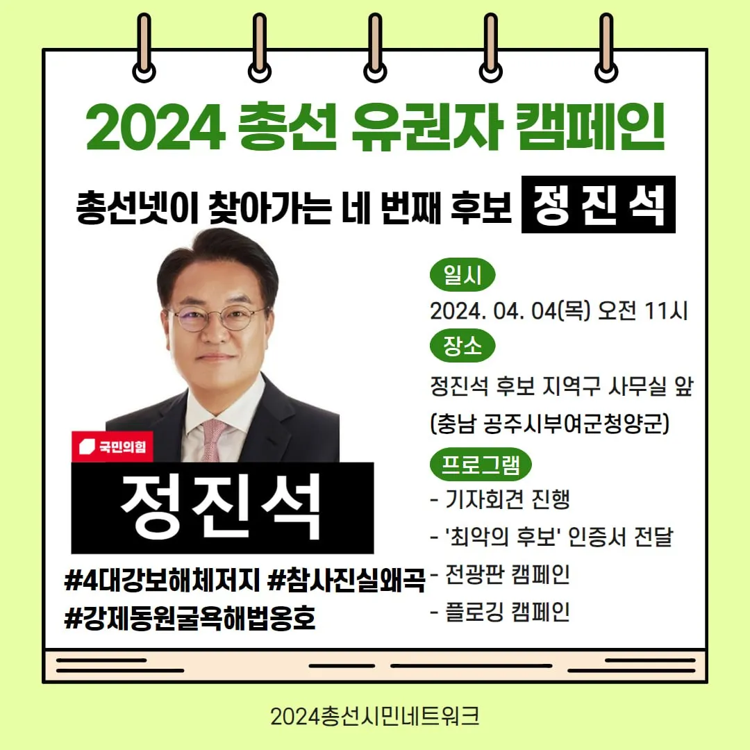 2024 총선시민네트워크는 4월 4일 (목) 오전 11시, 충남 공주시의 정진석 후보 선거사무소 앞에서 기자회견 진행하며 최악의 후보 인증서를 전달하고, 지역 유권자들을 향한 1인시위를 진행하였습니다!