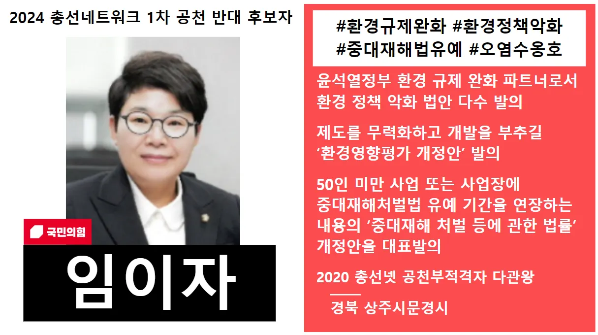구체적인 선정사유 | (1) 임이자 의원은 21대 국회의 환경노동위원회 여당 간사로서 경유 자동차 판매 금지 유예 법안, 화학물질 관리 완화 법안, 환경영향평가 완화 법안 등 환경규제 완화를 본격화하는 환경 악법 다수를 대표 발의하였음. 또한 윤석열 정부가 내세우는 ‘킬러 규제 혁파’로 대표되는 환경 규제 완화에 적극 발맞추는 입법과 발언을 서슴지 않는 등 윤석열 정부 환경 사안 일선의 파트너로서 환경 정책 악화에 크게 일조해왔음.